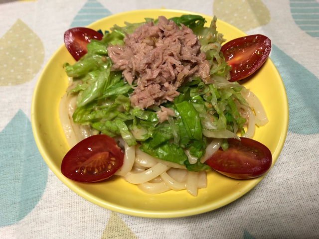 - 器に麺を盛り付け、レタス・ミニトマト・ツナを乗せたら完成。