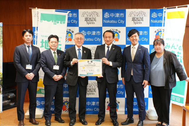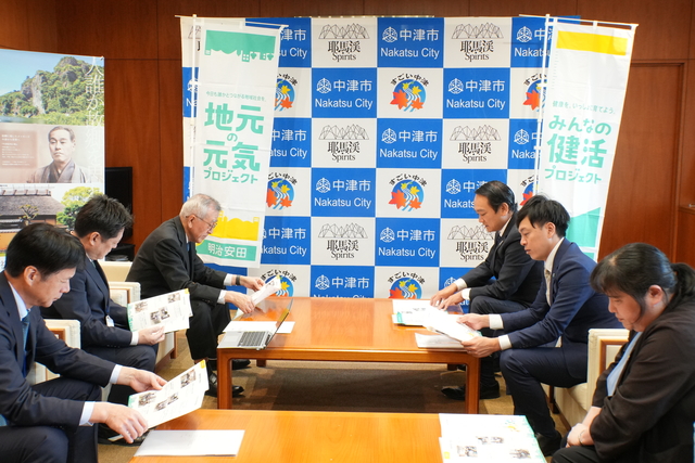 明治安田生命保険相互会社と中津市は令和3年に包括連携協定を結び、これまで様々な連携事業に取り組んできました。明治安田生命保険相互会社からの寄附は今回で7回目となり、いただいた寄附は、市の健康増進事業へと活用します。