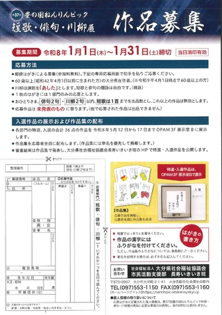 令和8年5月12日(火)から令和8年5月17日(日)に大分県立美術館(OPAM)にて開催される第37回豊の国ねんりんピック「短歌・俳句・川柳展」の作品を募集します。