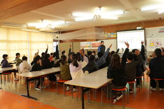 事務局員から三光コスモス祭りの説明が行われた後、児童からの質問を受けました。児童たちは「コスモス祭りで1番大変だったことは何ですか」、「コスモス祭りを始めたきっかけは何ですか」など自分たちで考えた質問をし、事務局からのお話を聞いてコスモス祭りへの理解をさらに深めました。