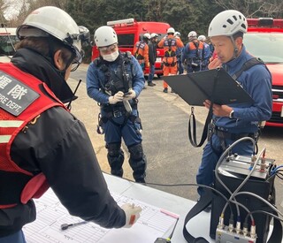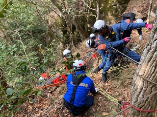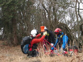この訓練は、八面山において登山者が滑落し、歩行ができなくなった事案を想定して行いました。険しい地形から迅速に負傷者を救出する手順を確認し、両機関の連携強化を図ることができました。