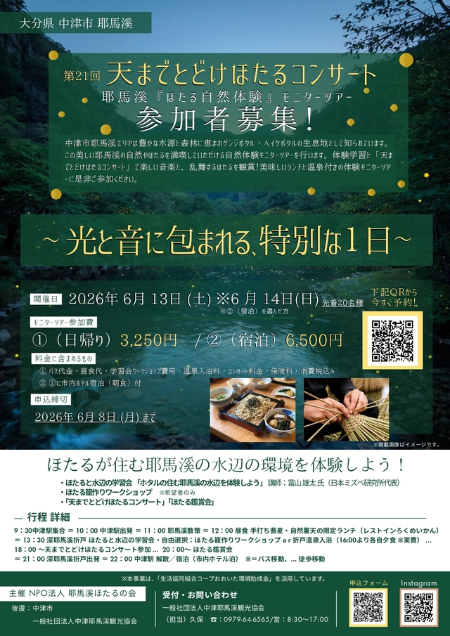 令和8年6月13日(土)に深耶馬折戸の「小さなお宿つきのほたる」にて「第21回天までとどけほたるコンサート」が開催されます。16時から焼き鳥やからあげなどの飲食物の販売、18時からコンサートが開演します。