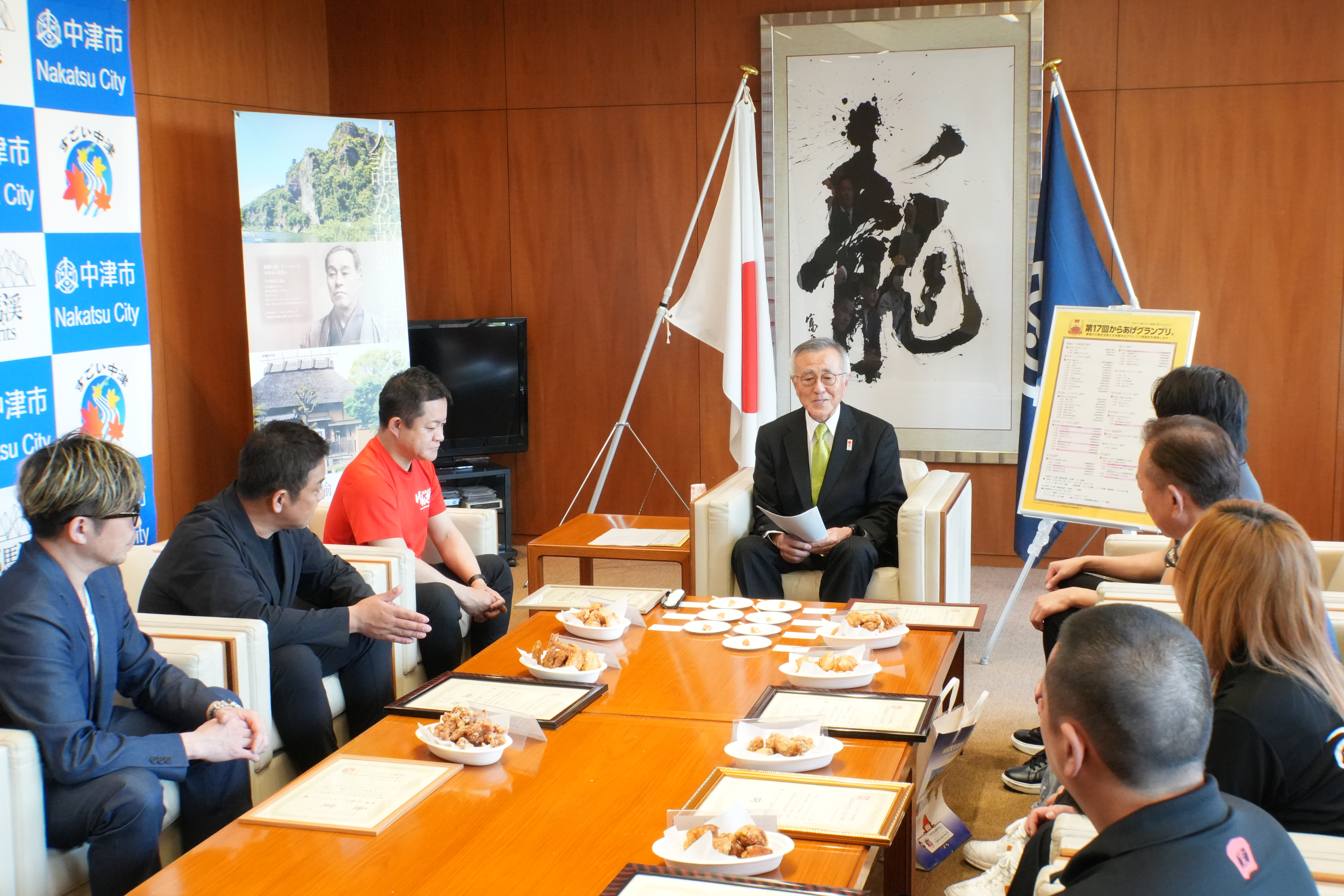 令和8年4月27日、中津市役所にて第17回からあげグランプリで受賞した各店舗の代表者の方々による受賞報告会がありました。中津市内のからあげ店においては7店舗9受賞に輝きました。