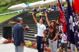 奥塚市長は「みなさんをお迎えできることを、心から喜び歓迎します。ここ耶馬溪アクアパークが水上スポーツのメッカとなっているのも、みなさんがお越しいただいている結果です。練習の成果を十分に発揮して頑張ってください。また、今年の7月に起こった豪雨災害の折には、福岡大学のみなさんが片づけに来ていただき、早期再開ができました。その節は本当にありがとうございました。今中津は行楽シーズン真っ只中です。競技は競技として頑張って、その後は中津を楽しんでください。そしてみなさん、得意なSNS等でPRをお願いします。」とあいさつしました。
