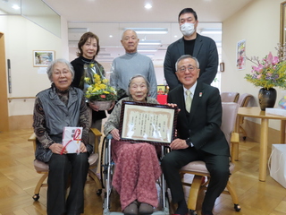 令和8年3月2日月曜日、百歳を迎えた中園 シゲ子さんのお祝いのため特別養護老人ホーム悠久の里を訪問し、お祝い状と記念品を贈りました。