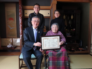 令和8年3月11日水曜日、百歳を迎えた村岡 ヤスさんのお祝いのためご自宅を訪問し、お祝い状と記念品を贈りました。